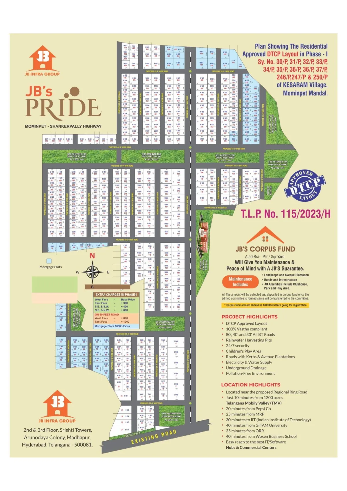 Located in the heart of the Western Hyderabad growth zone, JB’s Pride enjoys excellent connectivity and strategic positioning. Situated near the proposed Regional Ring Road, this location ensures seamless travel to key commercial and educational hubs.