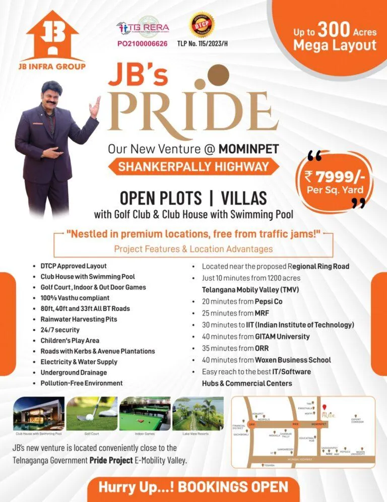 JB’s Pride is a new company offering land sizes starting at 220 square yards along the picturesque Mominpet Village Vikarabad Road and Tandur Road. Build the house of your dreams in a tranquil area amidst breathtaking scenery. Premium features and amenities are offered by JB’s Pride, including a DTCP Approved plan, practical roads, round-the-clock security, a kids’ play area, and a pollution-free environment.